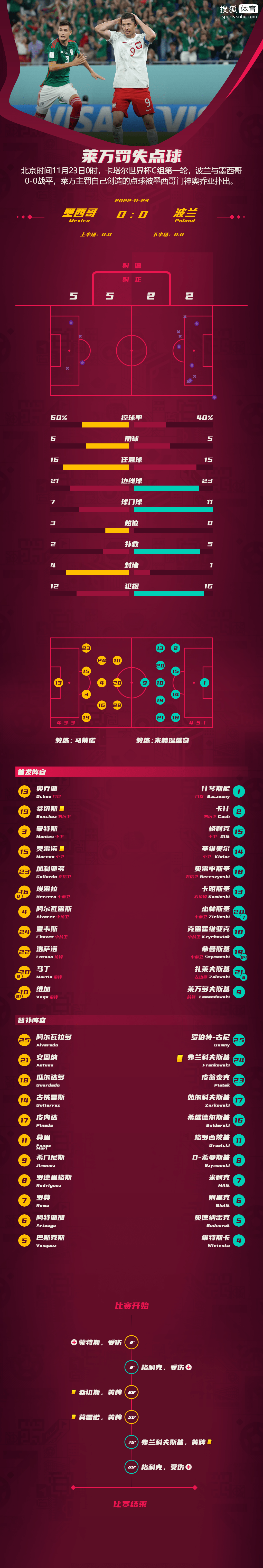 北京时间11月23日零时,2022年卡塔尔世界杯C组第一轮的第二场比赛在教育城体育场打响,墨西哥对阵波兰。经过90分钟鏖战,波兰与墨西哥0-0战平,均积1分,并列排在C小组第二位。全场最有威胁的进攻发生在第58分钟,莱万多夫斯基主罚自己创造的点球被墨西哥门神奥乔亚扑出。此外,波兰门神什琴斯尼也做出过神扑,力保大门不失。这场比赛,是本届世界杯第二场白卷平局。