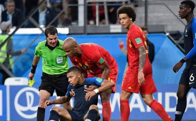 下半场比赛进入最后时刻,比利时一球落后发动了疯狂的反击,而法国队则是全队防守,压力如此之大的情况下,姆巴佩成为焦点,在一次死球后他拒绝立即还球给比利时队,他将球故意抛到场内,引起了比利时球员的不满,裁判给了姆巴佩黄牌,而后者也是再一次赢得了球迷的嘘声。