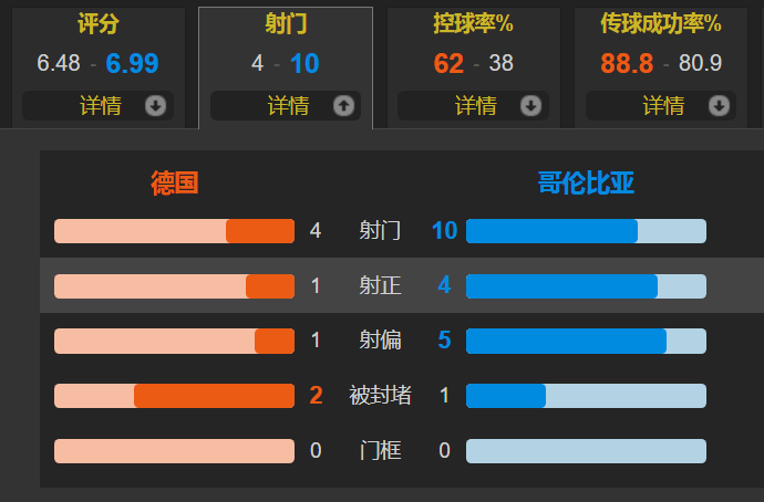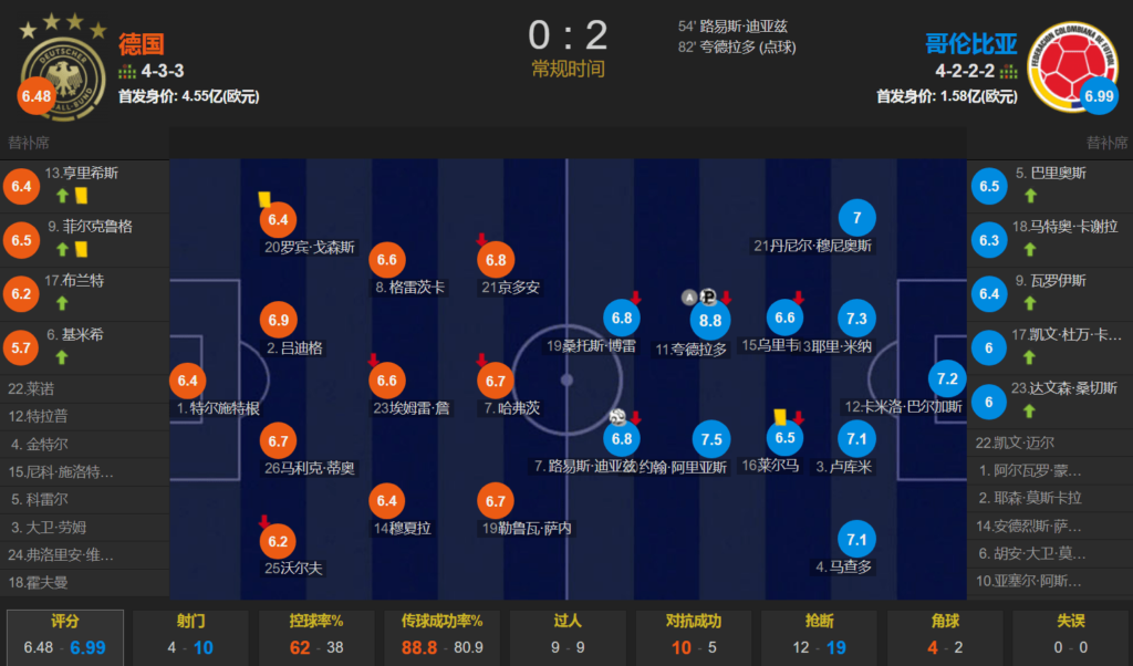 全场比赛,德国的控球率高达62%,一共仅有4次射正,就1次射正;哥伦比亚一共有10次射门,其中4次射正。最后再叨唠一句,德国战车已烂,唯有回炉重造,该换帅了。