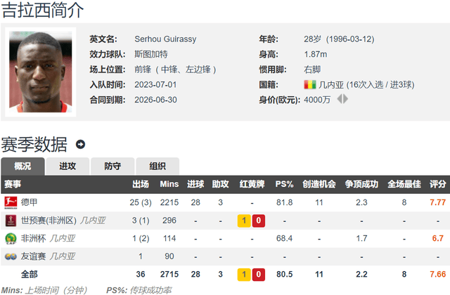吉拉西现年28岁,还处于当打之年,身高1.87米,右脚球员,几内亚前锋,中锋和左边锋都能踢。吉拉西上赛季德甲出场28次,其中25次首发,合计出场2215分钟,打入了28个进球,场均一球,还有3次助攻,不到80分钟就可以打入一个联赛进球。