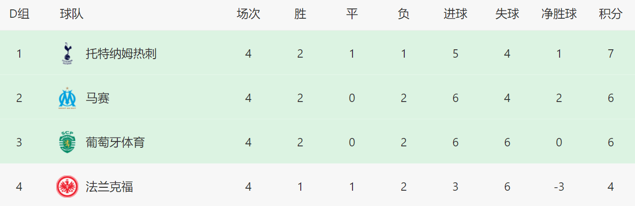 在刚刚结束的欧冠中,D组的出线形势发生了很大的变化。其中,热刺在3-2击败法兰克福后已经升至小组第一,里斯本竞技在主场2-0输给马赛后跌至第三。