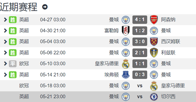 曼城本赛季正在冲击三冠王伟业,足总杯要与曼联争冠,欧冠已经杀入四强,半决赛次回合客场1-1战平皇马,而英超争冠也在36轮过后失去了悬念,瓜迪奥拉6年5夺英超冠军的伟大一刻就要来了。