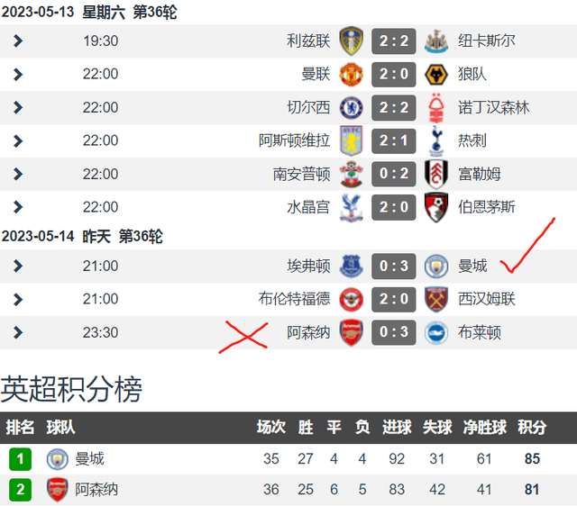 瓜迪奥拉的6年5冠要来了 阿森纳0-3布莱顿 曼城下轮赢球就夺冠