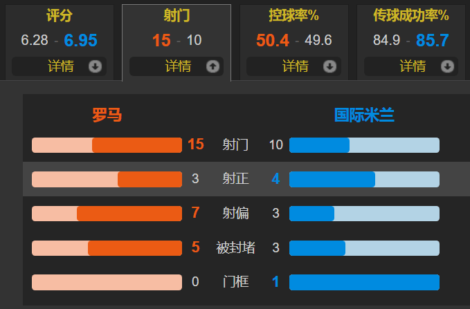 全场比赛,双方控球率五五开,罗马一共有15次射门,其中3次射正;国米一共有10次射门,其中4次射正