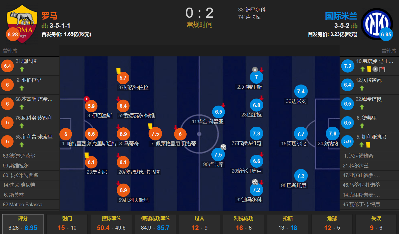 罗马抢了一下开局之后,但随着国米实力压制,罗马就处于劣势了,上半场国米双翼卫取得连线,邓弗里斯助攻迪马尔科推射打破场上僵局;下半场伊巴涅斯失误送大礼,劳塔罗断球送助攻,卢卡库单刀轻松破门,劳塔罗之后还射门中楣。最终,国米客场2-0击败罗马,赢得争四关键战并升至第四,罗马继续排名第七,争四难了,穆里尼奥下赛季的欧冠席位还需要期待欧联夺冠。