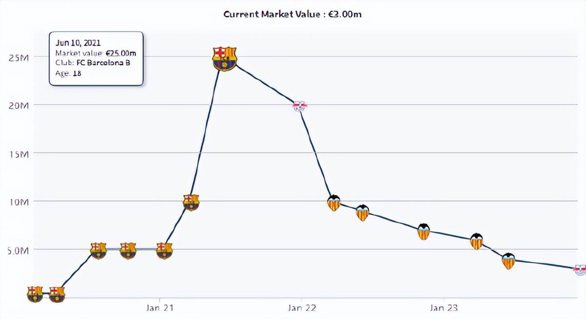 此后的2年半时间里,他先后3次被外租到西甲,身价也从在巴萨时最高的2500万欧元,下滑到这会儿仅有300万欧元。