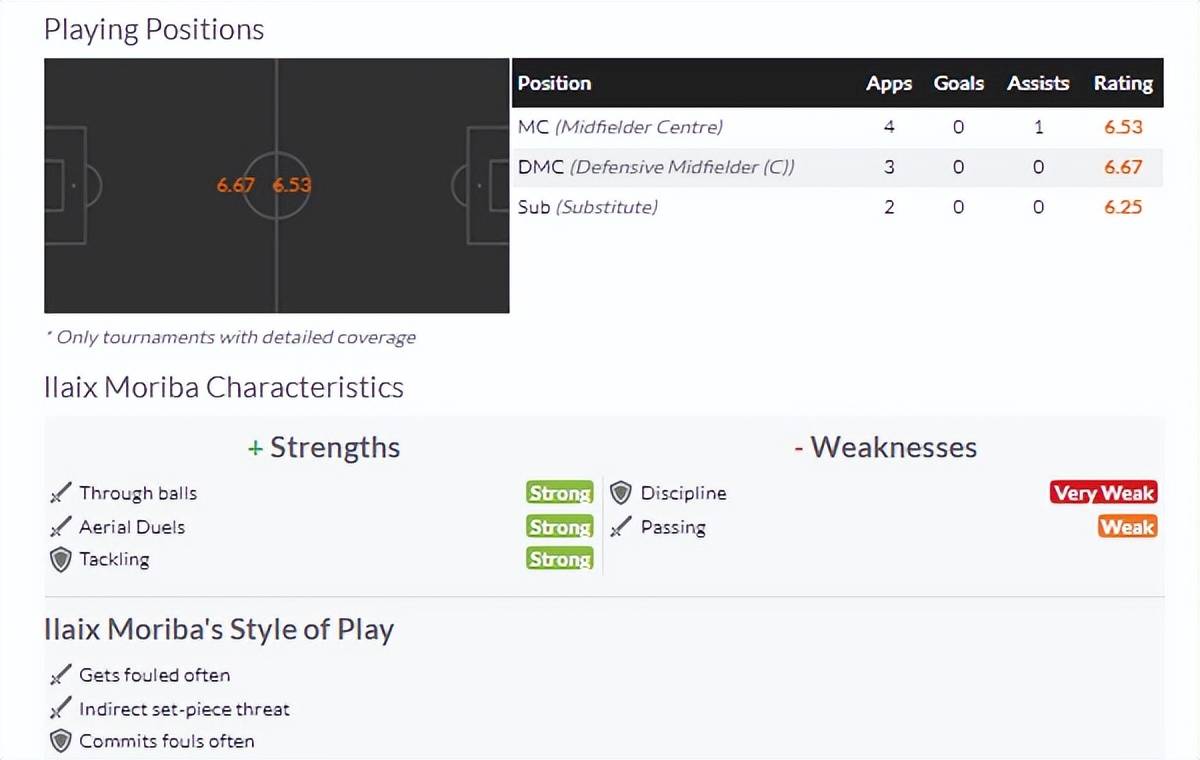 从数据统计网站给出的评价可以看到,莫里巴的优势是直塞球、高球对抗和抢断,劣势是传球失误多,以及红黄牌控制的较差。
